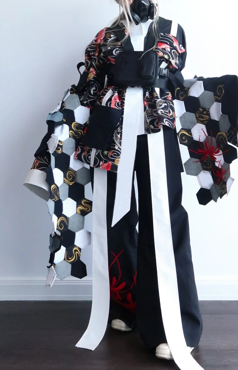 This piece within the ‘Boketto’ utilises by the traditional Japanese print and silhouette in conjunction with a dystopian twist through large cargo pockets, reflective fabric and a mysterious atmosphere.
